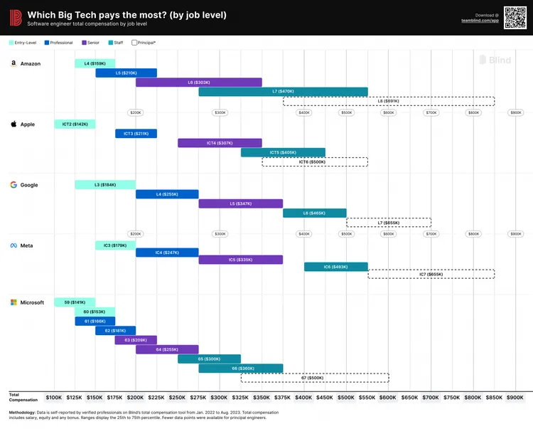 Um novo relatório do Blind, fórum anônimo para funcionários de tecnologia, revelou que o Google e a Meta estão entre as empresas que pagam mais a seus engenheiros de software. As big techs estão na frente de nomes como Apple, Microsoft e Amazon.