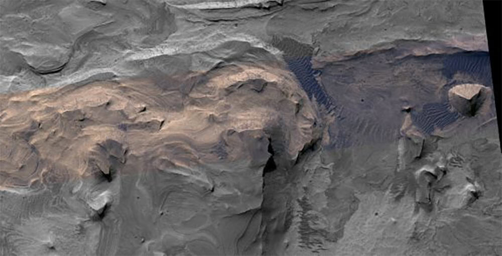 O contexto geológico em que a formação se encontra, aparecendo no canto direito. Créito: NASA/JPL-Caltech/UArizona