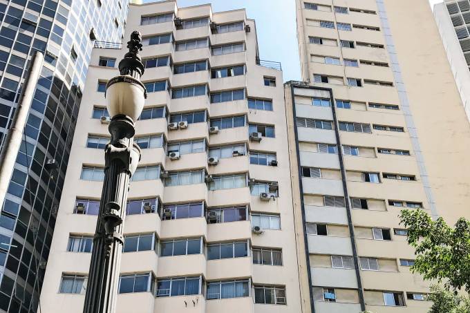 Quebra-sóis fixos para proteger escritórios do sol; no topo, antigas cores do edifício da Rua Jaguaribe, hoje pintado de gelo e azulRaul Juste Lores/Veja SP