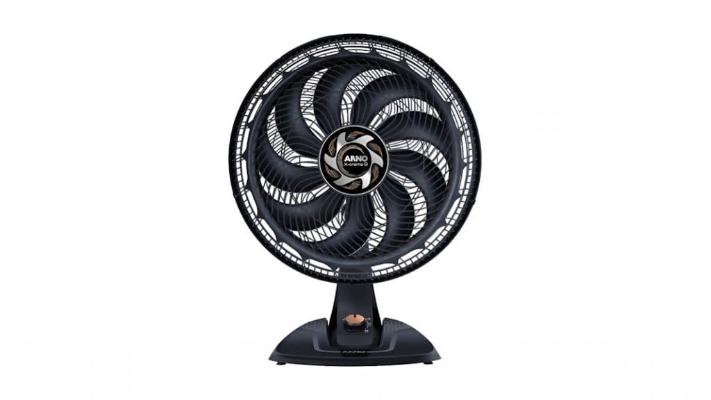 O Arno X-treme VE94 é um ventilador de mesa de 40 cm que utiliza um motor de 160 W para movimentar hélices grandes. A estrutura combina as grades circulares e o cabeçote que concentra todos os comandos básicos do aparelho. É um modelo de porte maior dentro da categoria de mesa.
