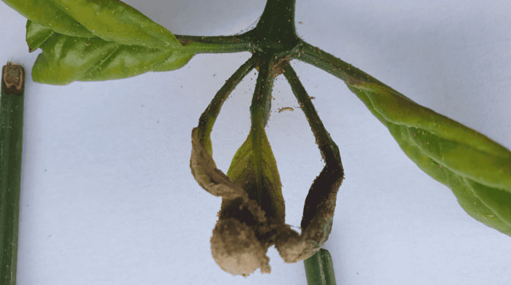 Os pesquisadores identificaram o ácaro em folhas jovens do café, causando deformações, necrose e queda prematura. O padrão chamou atenção dos pesquisadores, já que a praga costuma atacar folhas mais velhas em outras culturas antes de ser descoberta no café.