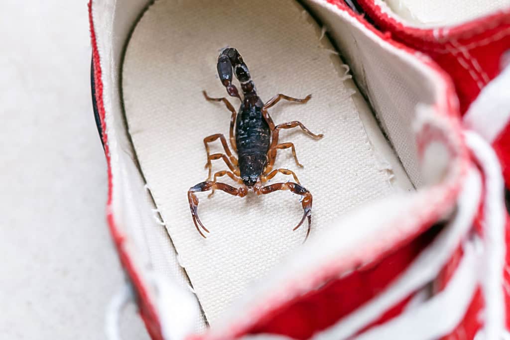 Escorpião-marrom, também conhecido como escorpião-negro, dentro de um tênis. A espécie Tityus bahiensis é encontrada do leste e centro do Brasil (Imagem: RHJPhtotos / Shutterstock)