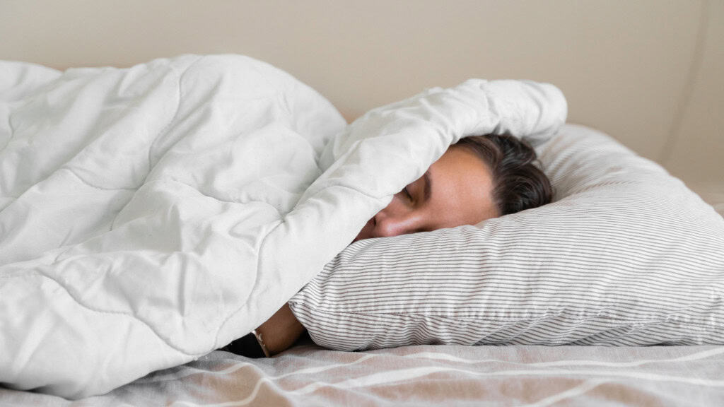 Mulher jovem da geração millennial dormindo coberta com cobertor. Inverno frio. Sem aquecimento em casa. Ronco alto. Sonhos doces. Ciclos circadianos.